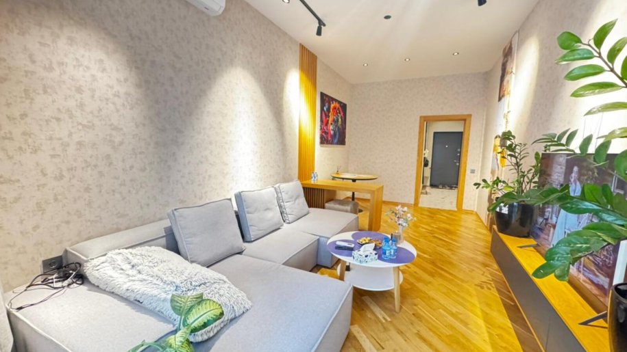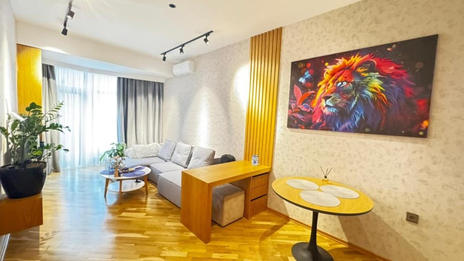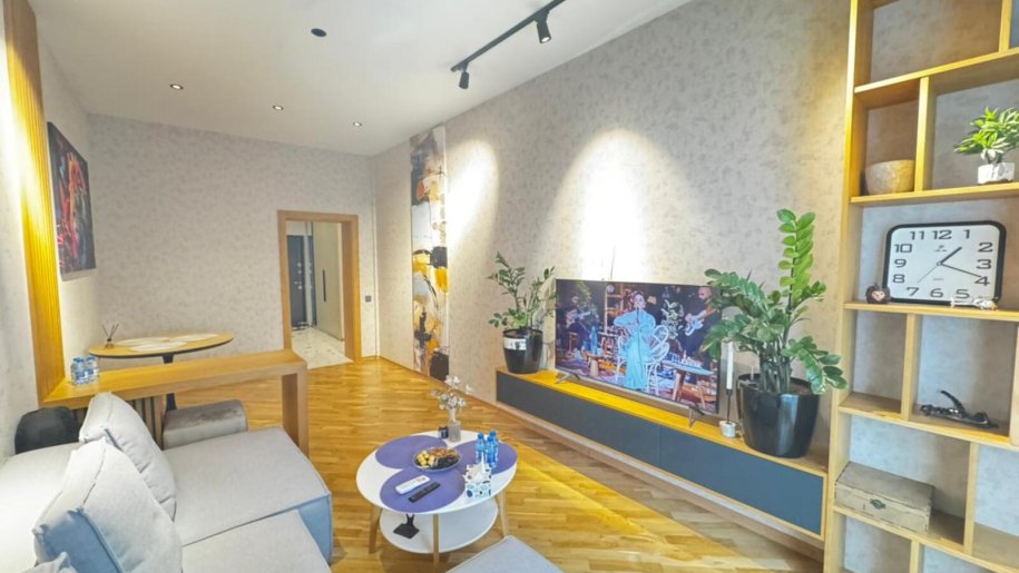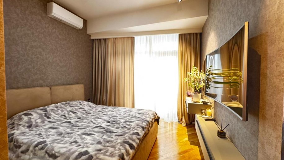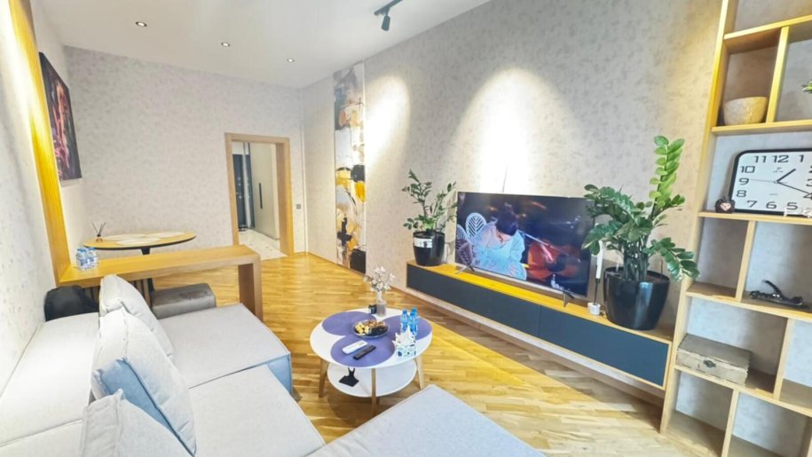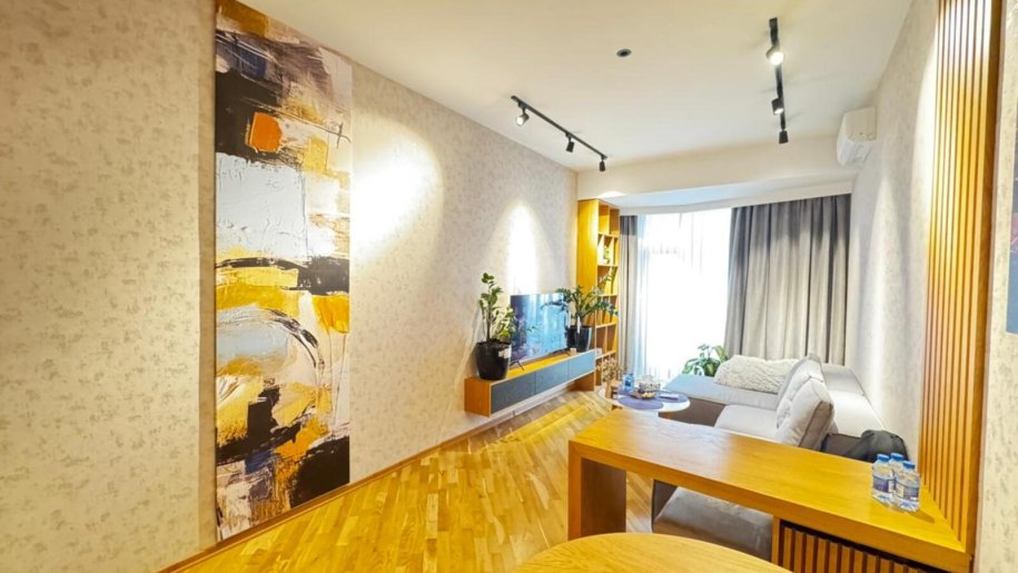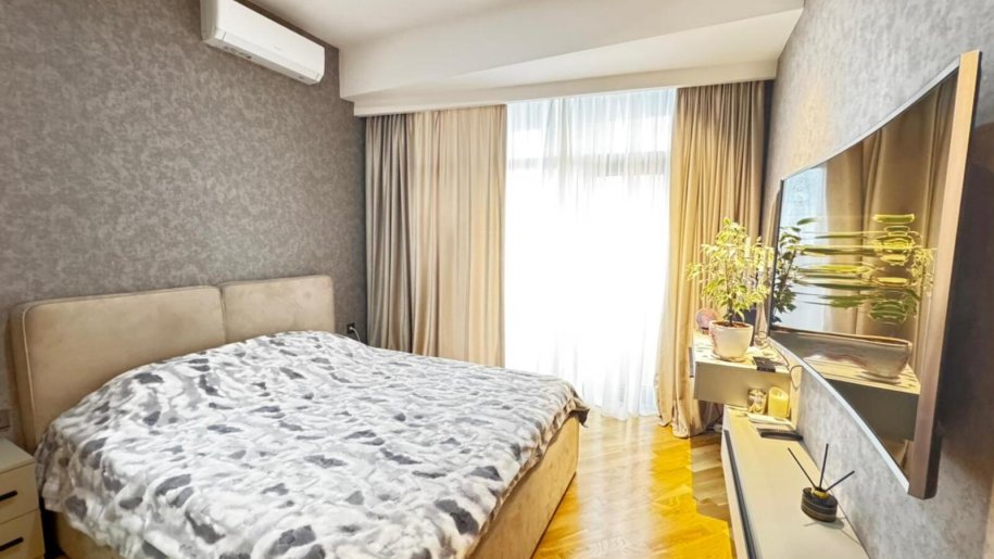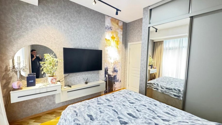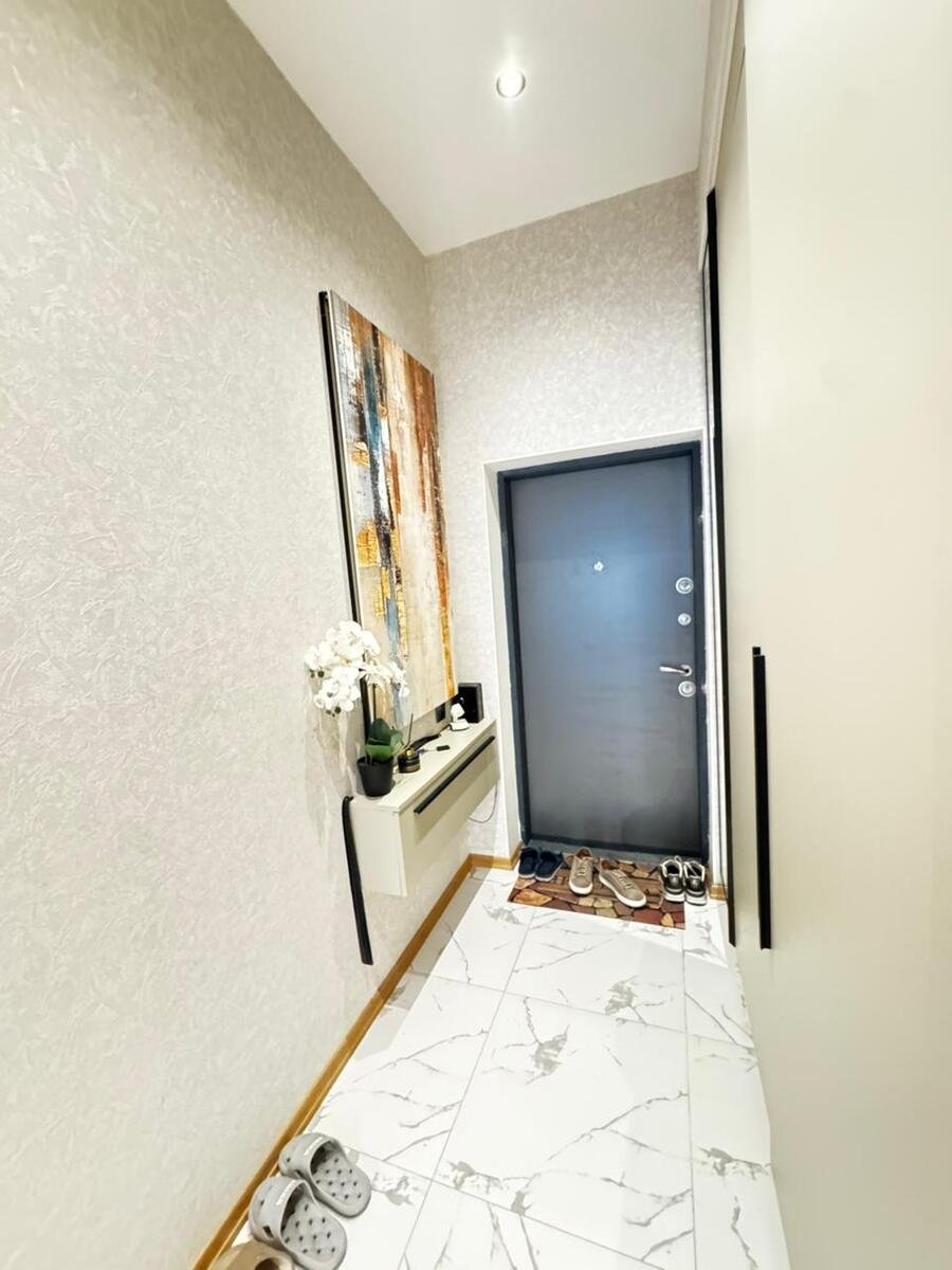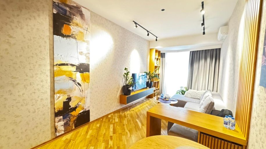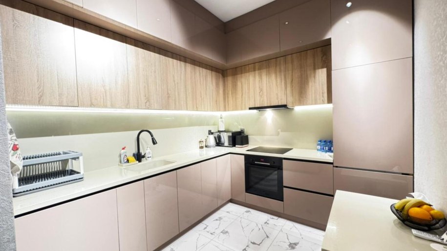 Close to PORT BAKU an elite residential complex 2 -rooms apartment for rent with amazing city view. The apartment is equipped with everything necessary for a comfortable stay. Heating, split air conditioning, washing machine, internet, etc. 24/7 security.