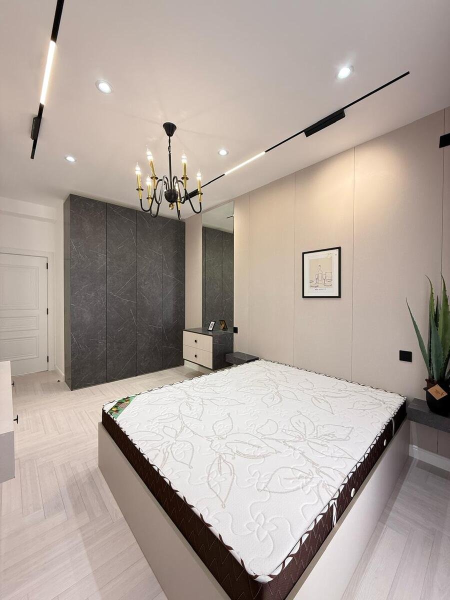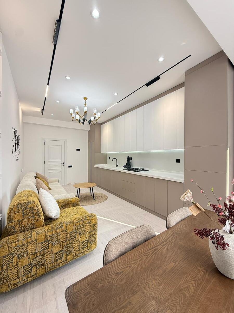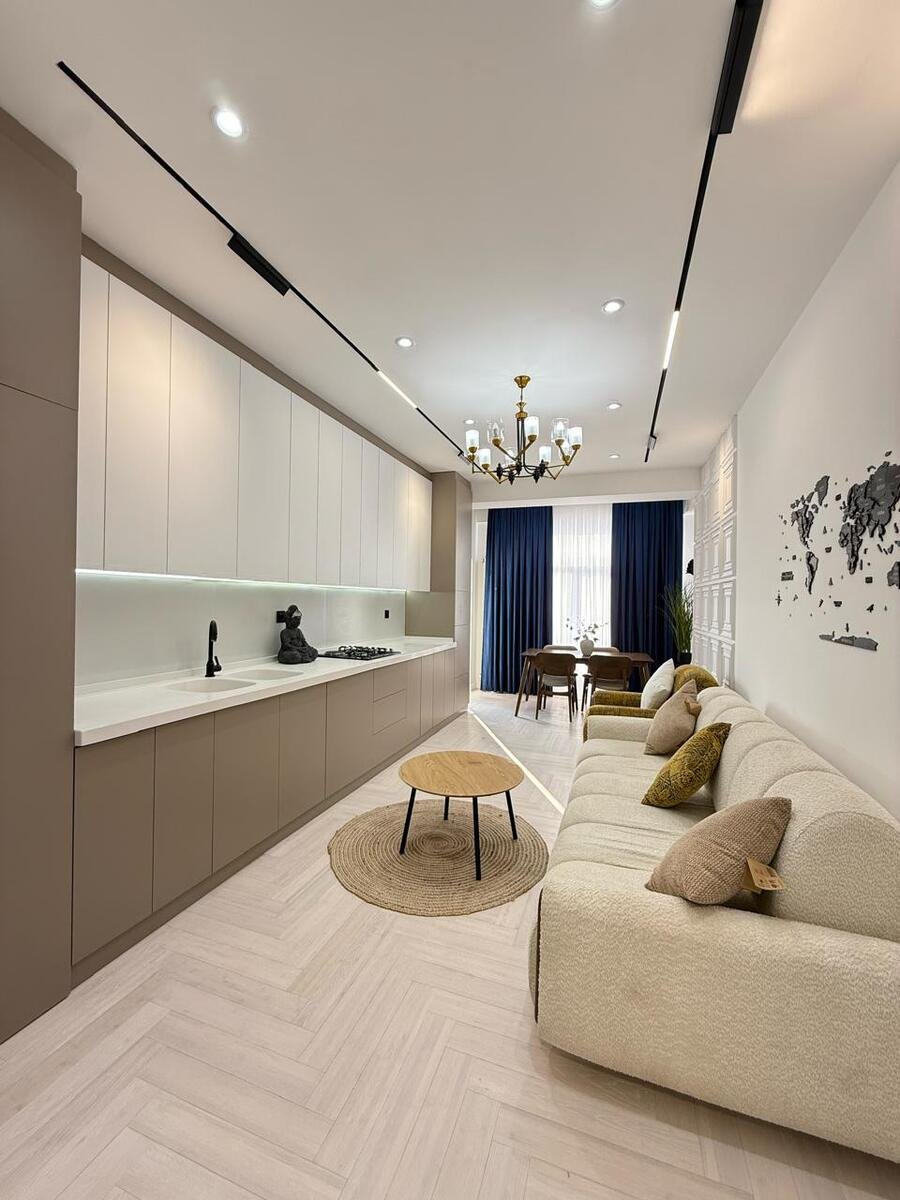 Mənzilin quraşdırılmış mətbəx mebeli, eyvanı, kombi sistemi, duş kabinası və s var.