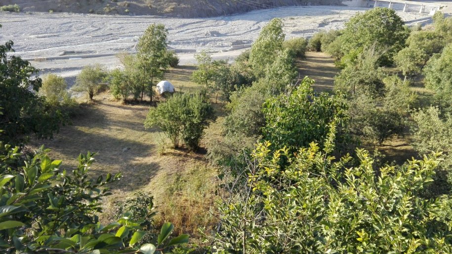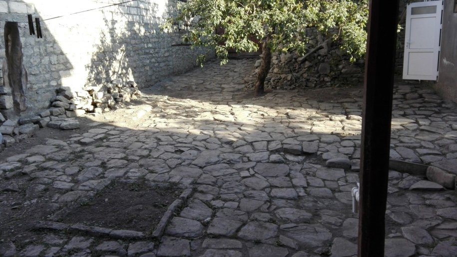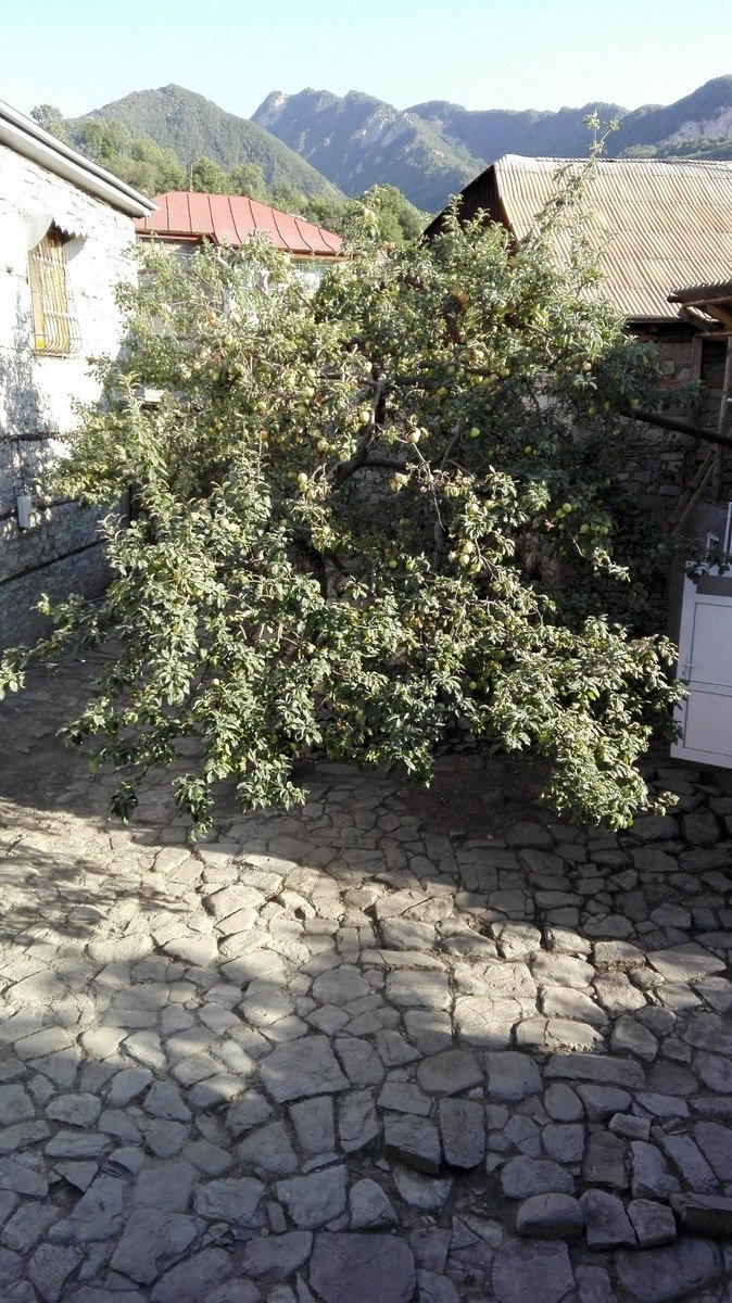 Həyətdə müxtəlif meyvə ağacları, mərkəzə hissədə.