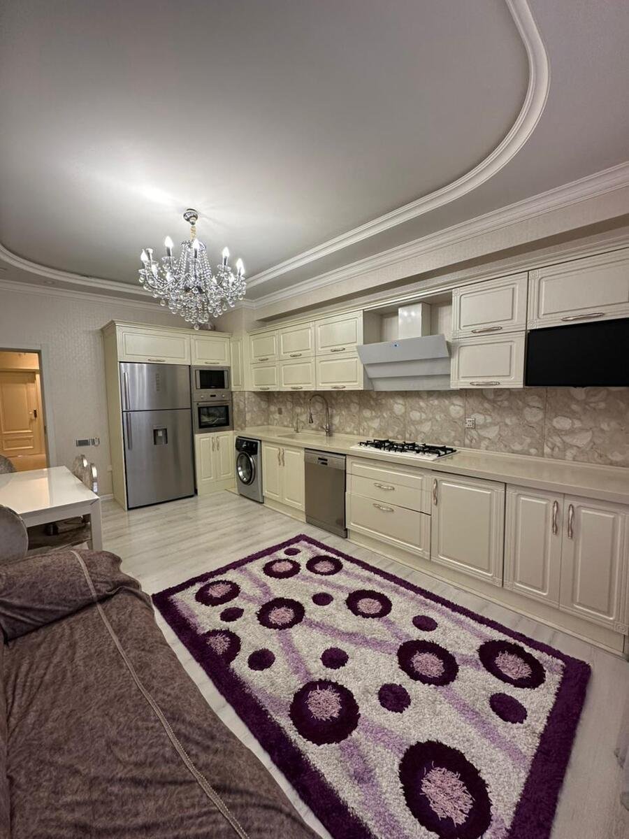 Həmizə Babaşov küçəsində, Zərifə Əliyeva Parkının yaxınlığında, yeni inşa olunmuş 17 mərtəbəli binanın 6-cı mərtəbəsində yerləşən, 3 otaqlı, 146 m² sahəyə malik, super təmirli və tam əşyalı mənzilin geniş və cəlbedici təsviri: