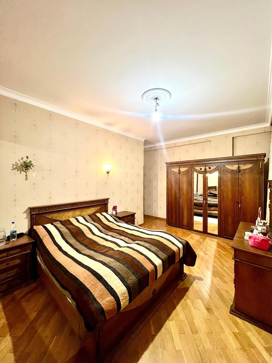Mənzil 160-165kv.Otaqların önü açıqıdır və geniş şəhər görüntüsü var.Çox səliqəli planlama- Kvadrat formalı qonaq,mətbəx,valideyn yataq otagı və orta kiçik 2 ədəd otaqlar.Eyvanı və 2 ədəd s/q var.