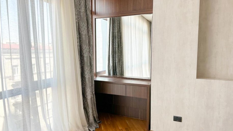В Центре города между метро Ичери Шехер и площади фонтанов сдаётся 3 комнатная квартира в новострройке,ремонт свежий минимолизм,обстановка вся,комнаты раздельные и светлые.
