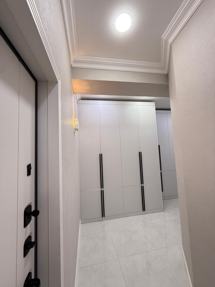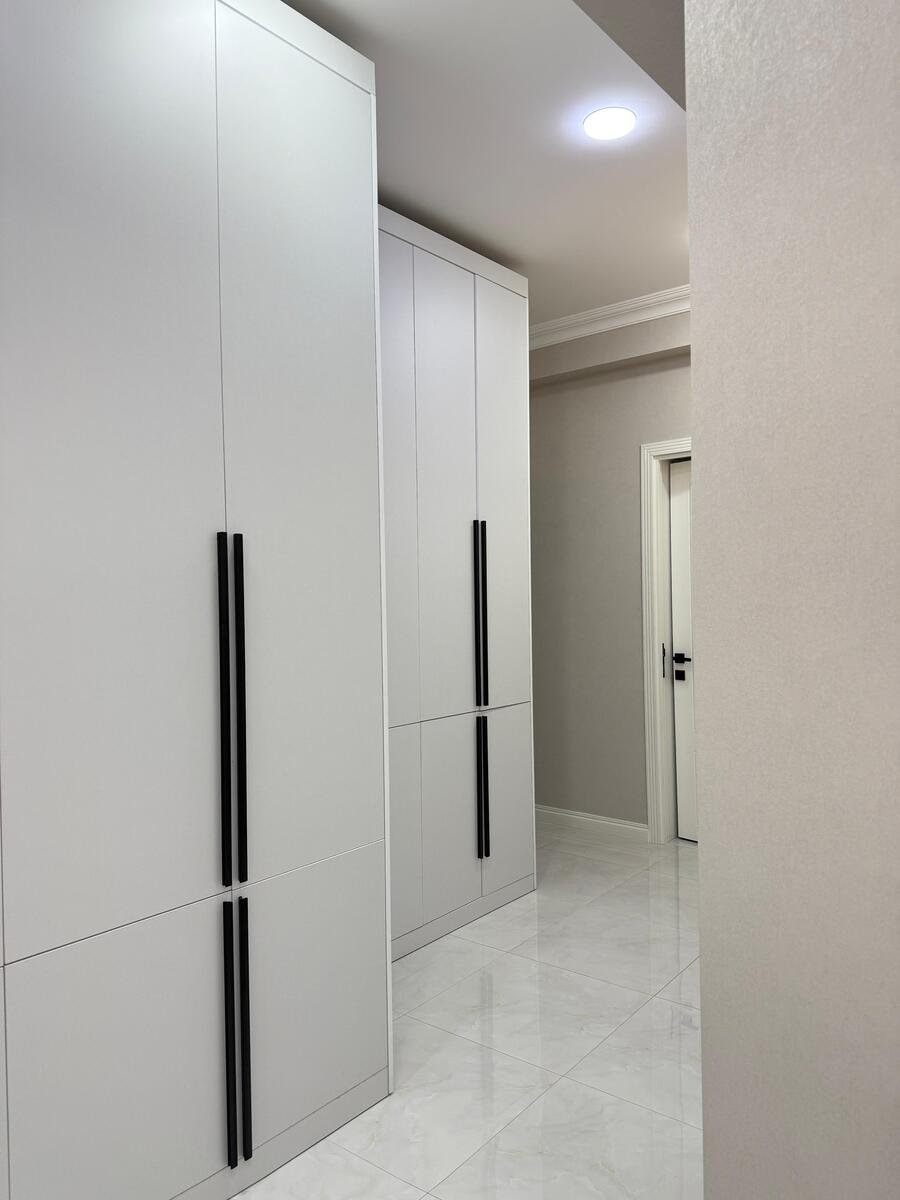 Koridor, yataq otağı və mətbəxdə geniş şkaflar yığılıb.