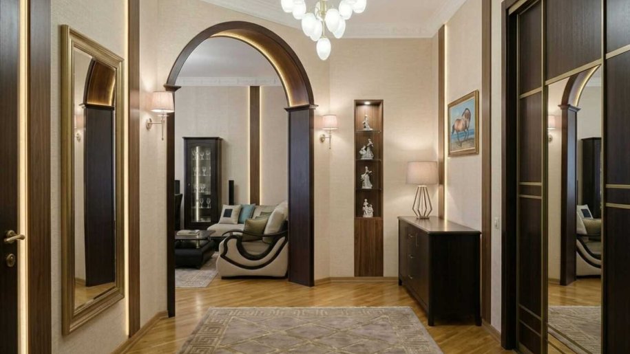* Eksklüziv Dizayn: Tünd ağac panellər, lüks bej-qızılı divar kağızları və modern işıqlandırma ilə təchiz olunmuş interyer.