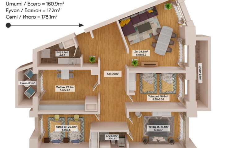 Satılır 4 otaqlı yeni tikili, 178.1 m2, Xətai