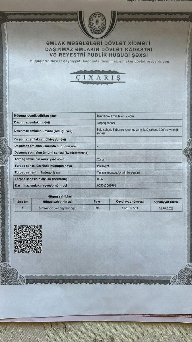 3 cu yasayis sahesi sahe 6412 sot torpaq sahesidi cixarisi senedleri qaydasindadir.6 sotu satilir ...